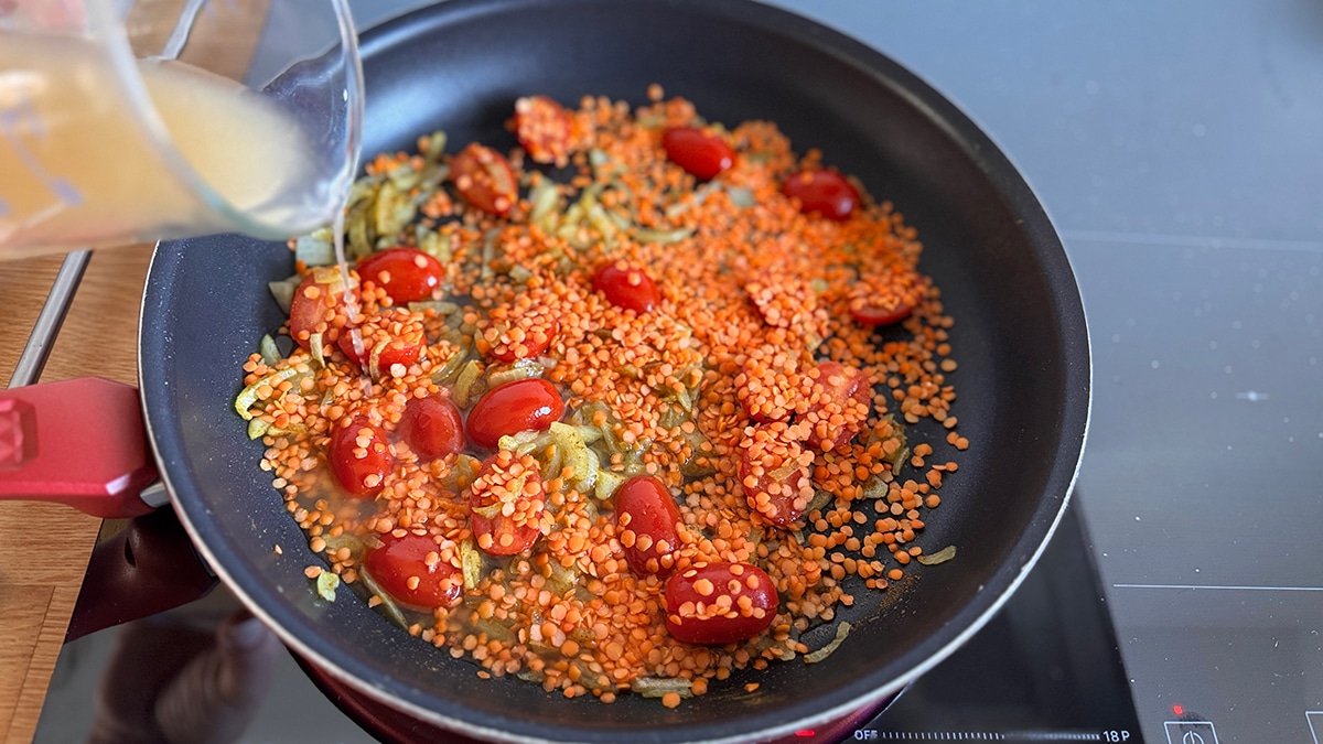 - Ajoutez les lentilles corail, puis versez le bouillon.